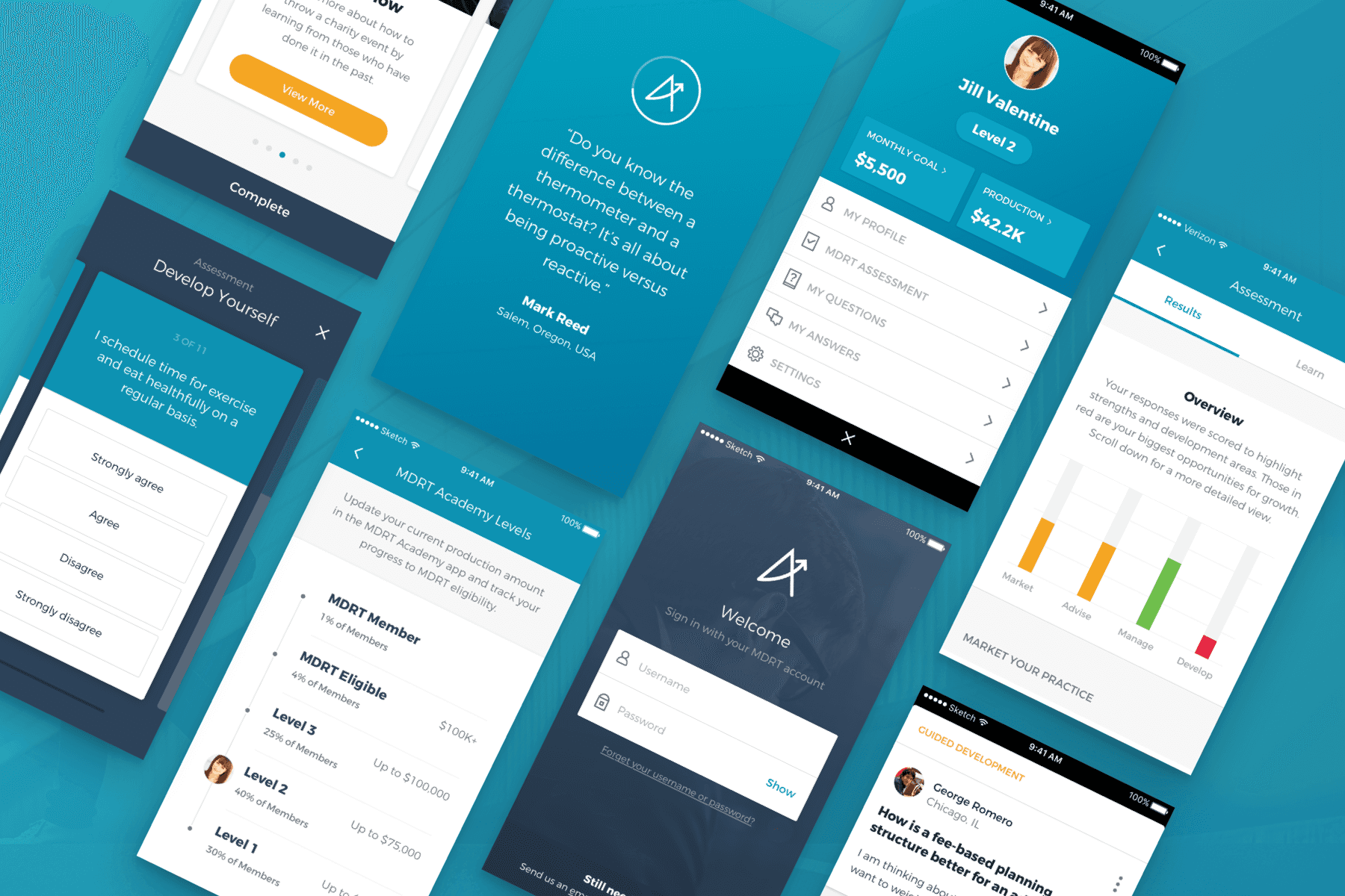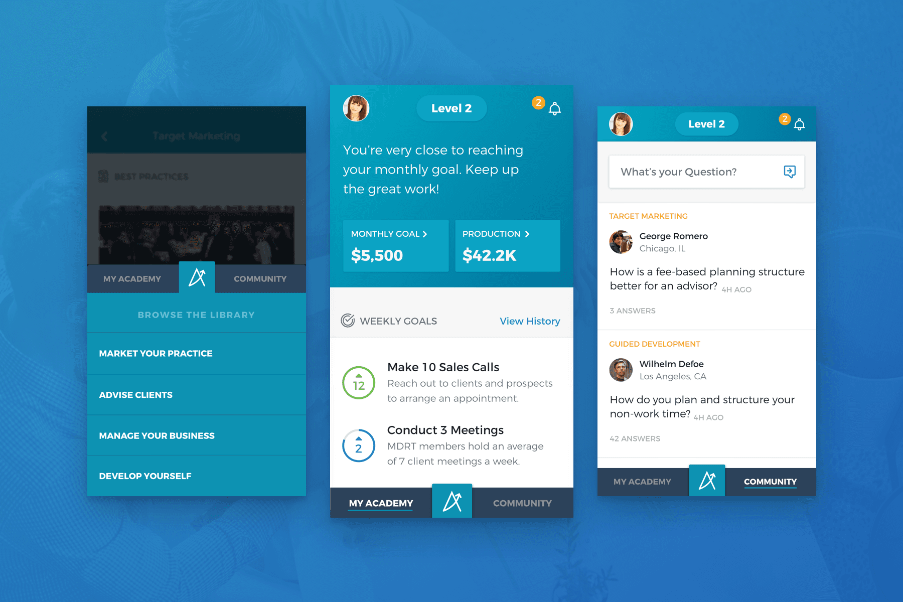 A custom-branded mobile and web app experience for budding financial service professionals featuring seamless enrollment, mentorship, production tracker tools, relevant content, gamification, and easily navigable goal tracking all geared towards reaching the Academy’s international target audience and helping them learn from industry leaders, build successful habits, and gain access to tools needed to professionally thrive.